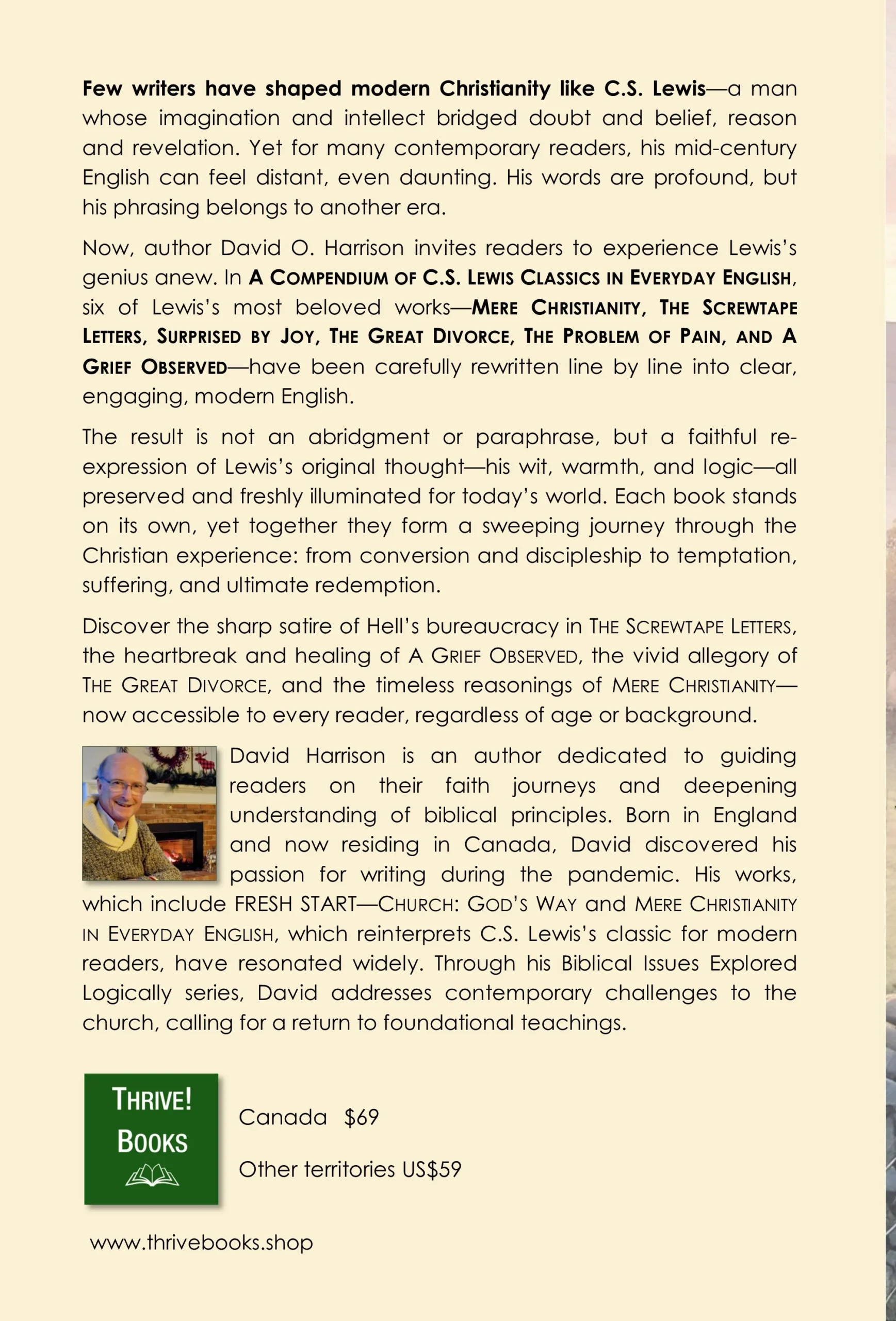 Now, author David O. Harrison invites readers to experience Lewis’s genius anew. In A Compendium of C.S. Lewis Classics in Everyday English, six of Lewis’s most beloved works—Mere Christianity, The Screwtape Letters, Surprised by Joy, The Great Divorce, The Problem of Pain, and A Grief Observed—have been carefully rewritten line by line into clear, engaging, modern English.