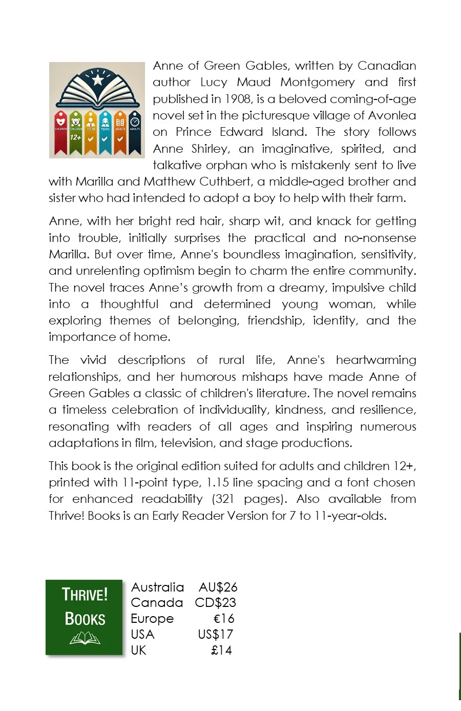 Anne of Green Gables, written by Canadian author Lucy Maud Montgomery and first published in 1908, is a beloved coming-of-age novel set in the picturesque village of Avonlea on Prince Edward Island. The story follows Anne Shirley, an imaginative, spirited, and talkative orphan who is mistakenly sent to live with Marilla and Matthew Cuthbert, a middle-aged brother and sister who had intended to adopt a boy to help with their farm.