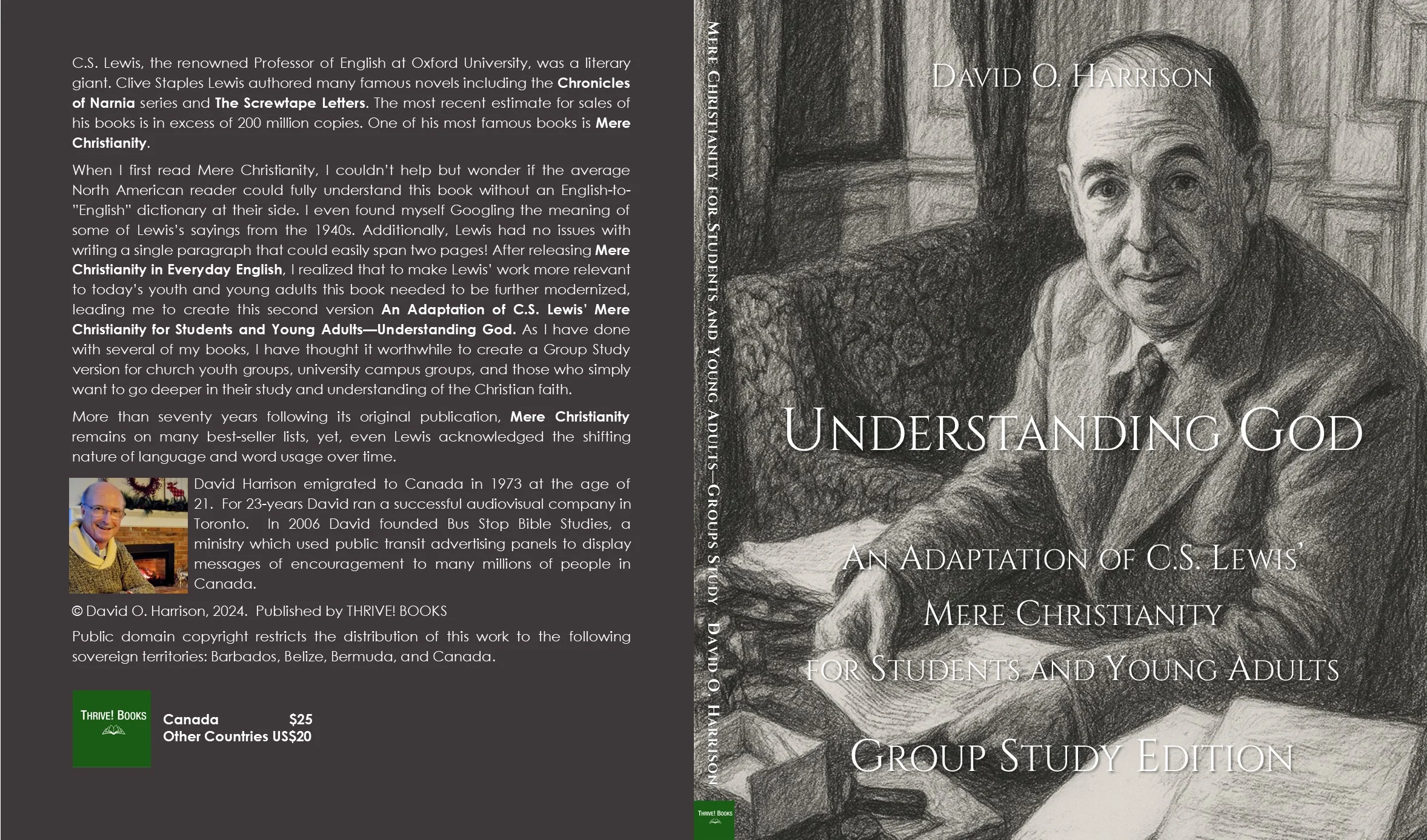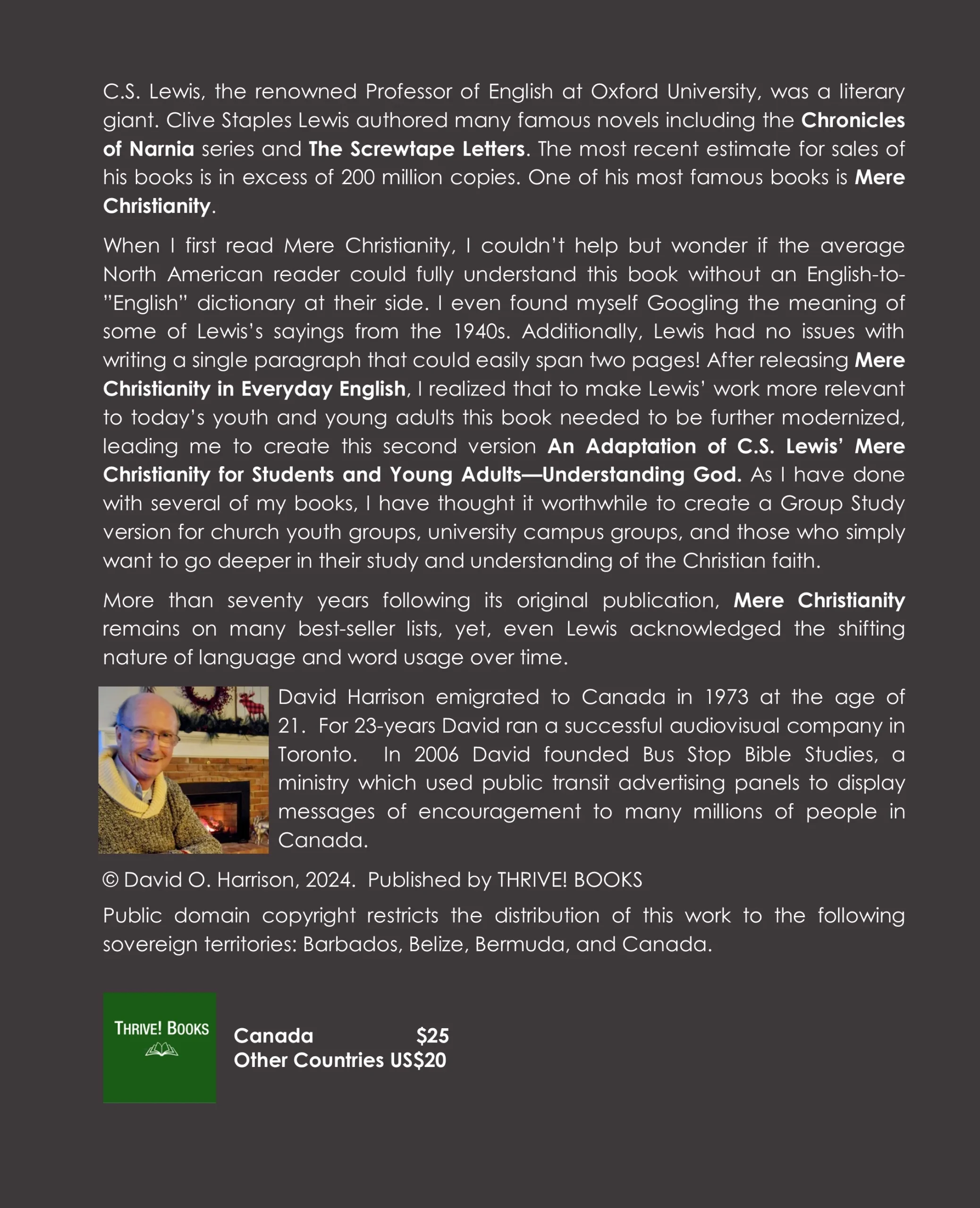 When I first read Mere Christianity, I couldn’t help but wonder if the average North American reader could fully understand this book without an English-to-”English” dictionary at their side. I even found myself Googling the meaning of some of Lewis’s sayings from the 1940s. Additionally, Lewis had no issues with writing a single paragraph that could easily span two pages! After releasing Mere Christianity in Everyday English, I realized that to make Lewis’ work more relevant to today’s youth and young adults this book needed to be further modernised, leading me to create this second version An Adaptation of C.S. Lewis’ Mere Christianity, for Students and Young Adults – Understanding God.