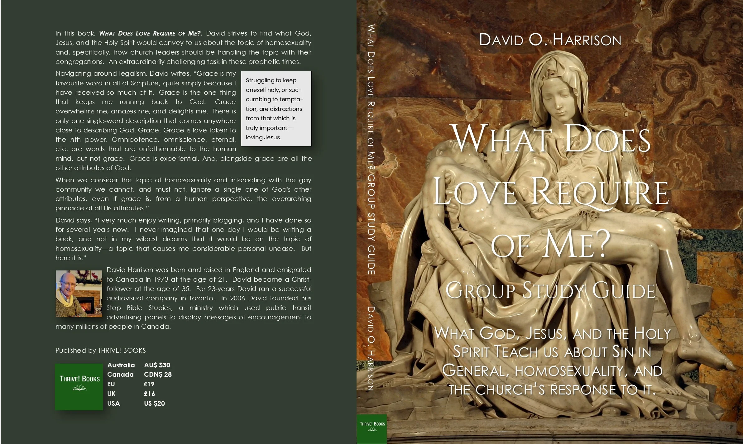 He recently read *Irresistible: Reclaiming the New that Jesus Unleashed for the World* by Pastor Andy Stanley. In this ‘must-read’ book, Stanley asks, “What does love require of me?” This question has haunted David since he read it. Regarding sexuality and God’s people, David believes this question is crucial, so he includes it at the top of each page in his book as a constant reminder while seeking answers to challenging questions.